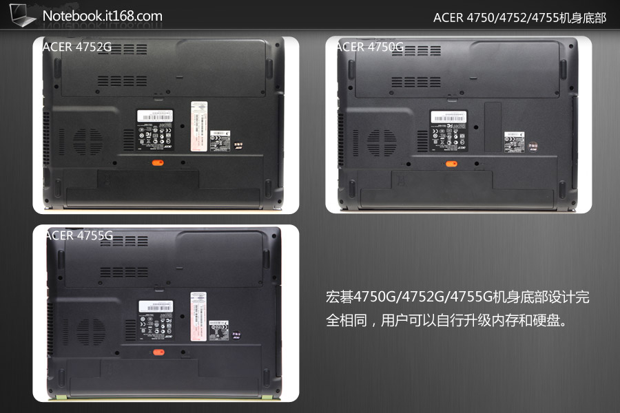 宏碁4750G/4752G/4755G机身底部设计完全相同,用户可以自行升级内存和硬盘。