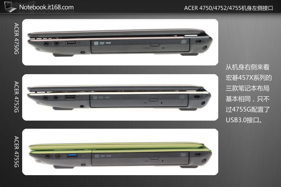 从机身右侧来看宏碁457X系列的三款笔记本布局基本相同,只不过4755G配置了USB3.0接口。
