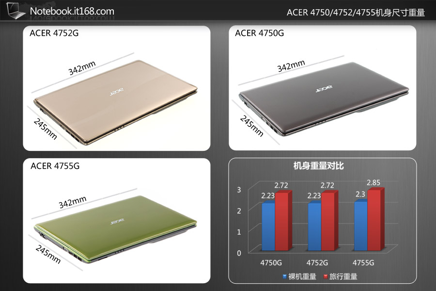 机身尺寸完全相同,重量上,4750G和4752G完全一样,而4755G略重一些。