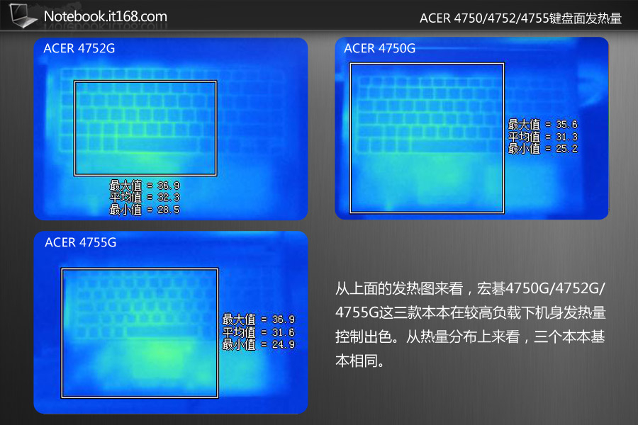 从上面的发热图来看,宏碁4750G/4752G/4755G这三款本本在较高负载下机身发热量控制出色。从热量分布上来看,三个本本基本相同。