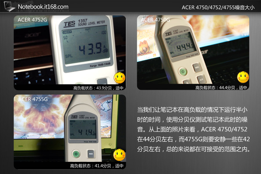 当我们让笔记本在高负载的情况下运行半小时的时间,使用分贝仪测试笔记本此时的噪音。从上面的照片来看,ACER 4750/4752在44分贝左右,而4755G则要安静一些在42分贝左右,总的来说都在可接受的范围之内。