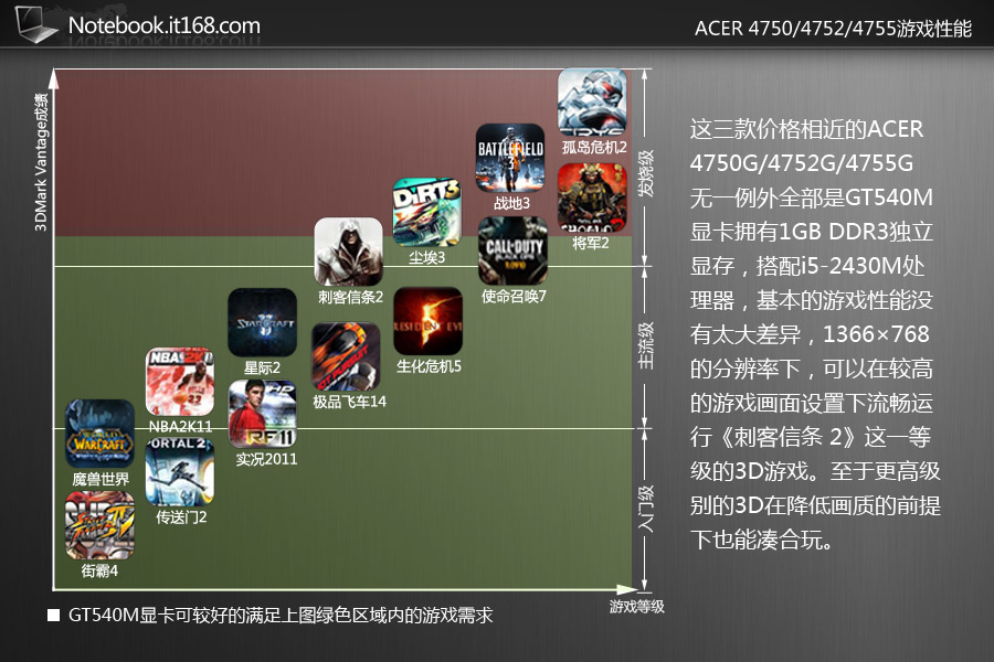 这三款价格相近的ACER 4750G/4752G/4755G无一例外全部是GT540M显卡拥有1GB DDR3独立显存,搭配i5-2430M处理器,基本的游戏性能没有太大差异,1366×768的分辨率下,可以在较高的游戏画面设置下流畅运行《刺客信条 2》这一等级的3D游戏。至于更高级别的3D在降低画质的前提下也能凑合玩。