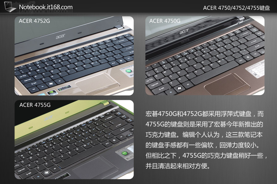 宏碁4750G和4752G都采用浮萍式键盘,而4755G的键盘则是采用了宏碁今年新推出的巧克力键盘。编辑个人认为,这三款笔记本的键盘手感都有一些偏软,回弹力度较小。但相比之下,4755G的巧克力键盘稍好一些,并且清洁起来相对方便。