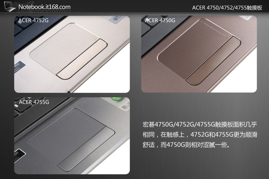 宏碁4750G/4752G/4755G触摸板面积几乎相同,在触感上,4752G和4755G更为顺滑舒适,而4750G则相对涩腻一些。