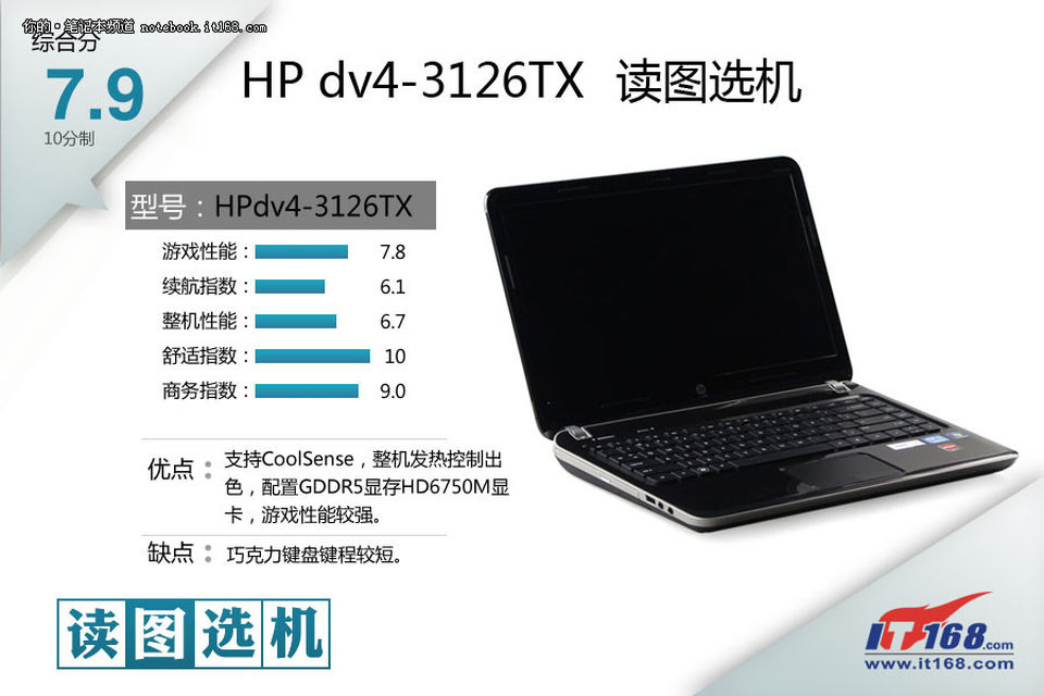 HP Pavilion dv4定位影音娱乐用户,搭载了酷睿i5处理器选用ATI Radeon HD 6750M独立显卡,拥有1GB GDDR5的显存容量,与目前众多使用GDDR3的显卡相比,GDDR5可以使显卡的整体性能有20%的提升。除此以外,为了使其在搭载高性能硬件的同时还能有良好的散热表现,该机使用了HP的CoolSense智能散热技术,在使用了低热导率元件的同时通过合理的设计优化了散热风道的方式有效降低了内部热量的堆积,目前其市场售价仅为5699元,是学生和家庭用户的首选机型。
