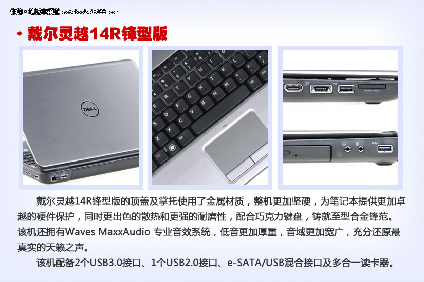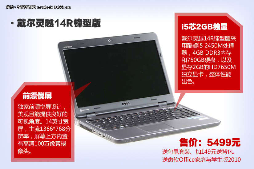 戴尔灵越14R锋型版采用酷睿i5 2450M处理器,4GB DDR3内存和750GB硬盘,以及显存2GB的HD7650M独立显卡,整体性能出色。