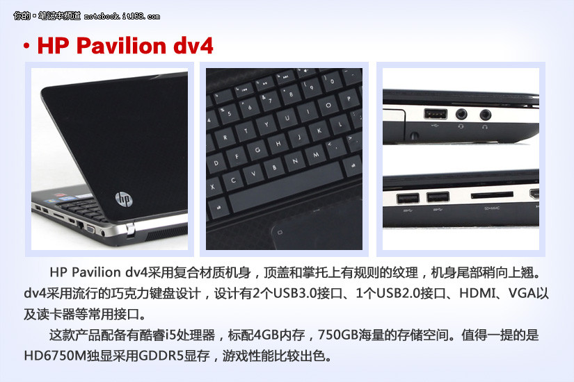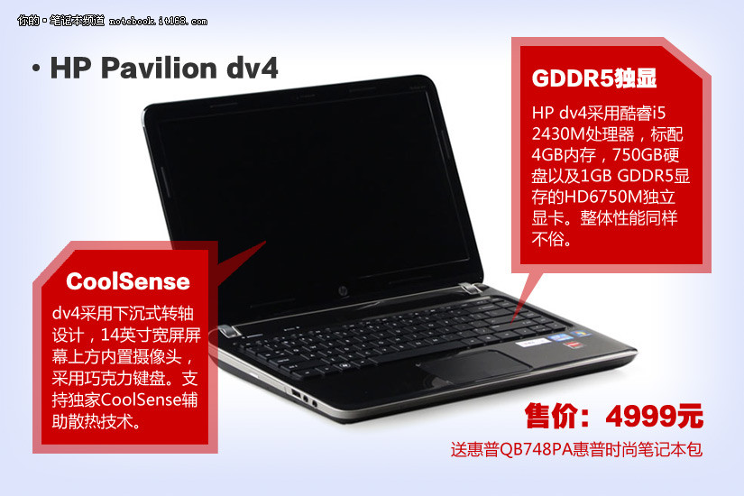 HP dv4采用酷睿i5 2430M处理器,标配4GB内存,750GB硬盘以及1GB GDDR5显存的HD6750M独立显卡。整体性能同样不俗。