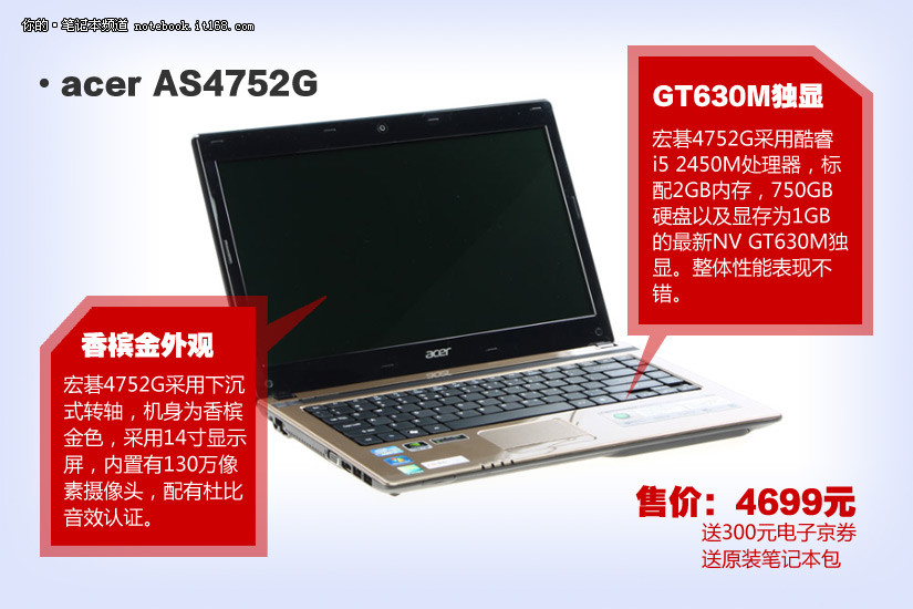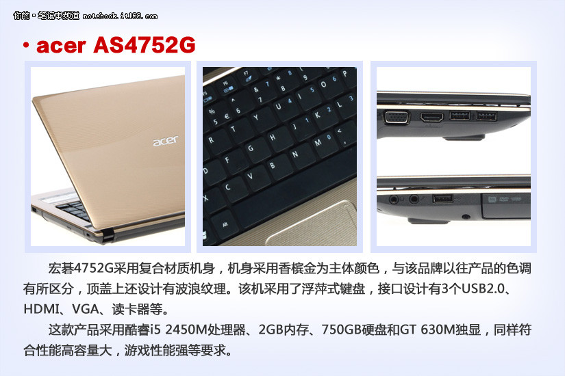 宏碁4752G采用酷睿i5 2450M处理器,标配2GB内存,750GB硬盘以及显存为1GB的最新NV GT630M独显。整体性能表现不错。
