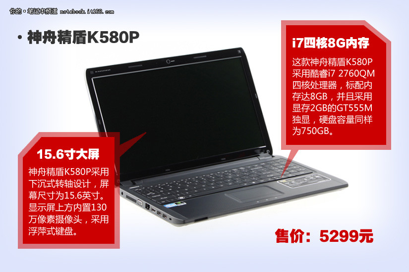 这款神舟精盾K580P采用酷睿i7 2760QM四核处理器,标配内存达8GB,并且采用显存2GB的GT555M独显,硬盘容量同样为750GB。