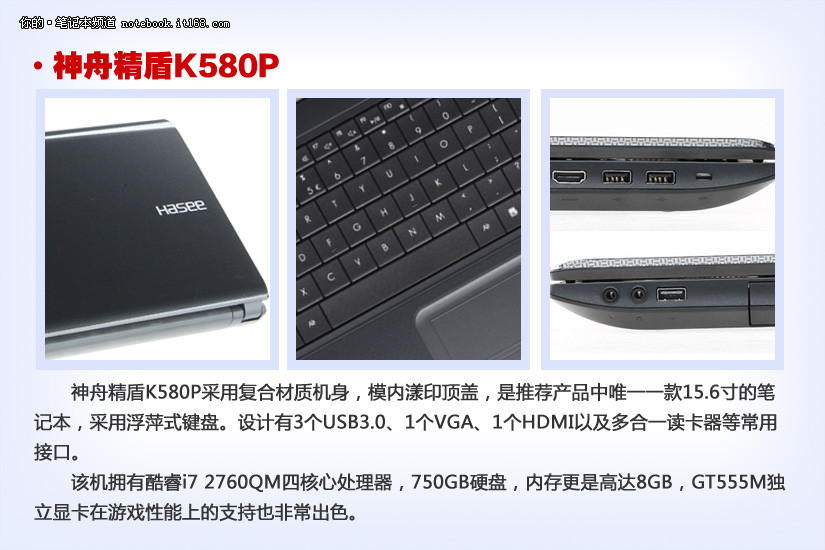 神舟精盾K580P采用复合材质机身,模内漾印顶盖,是推荐产品中唯一一款15.6寸的笔记本,采用浮萍式键盘。设计有3个USB3.0、1个VGA、1个HDMI以及多合一读卡器等常用接口。