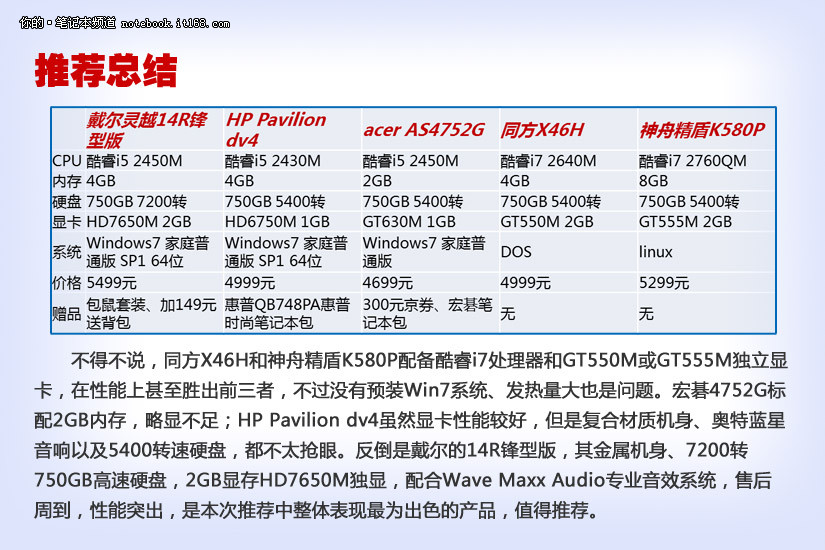 不得不说,同方X46H和神舟精盾K580P配备酷睿i7处理器和GT550M或GT555M独立显卡,在性能上甚至胜出前三者,不过没有预装Win7系统、发热量大也是问题。宏碁4752G标配2GB内存,略显不足;HP Pavilion dv4虽然显卡性能较好,但是复合材质机身、奥特蓝星音响以及5400转速硬盘,都不太抢眼。反倒是戴尔的14R锋型版,其金属机身、7200转750GB高速硬盘,2GB显存HD7650M独显,配合Wave Maxx Audio专业音效系统,售后周到,性能突出,是本次推荐中整体表现最为出色的产品,值得推荐。