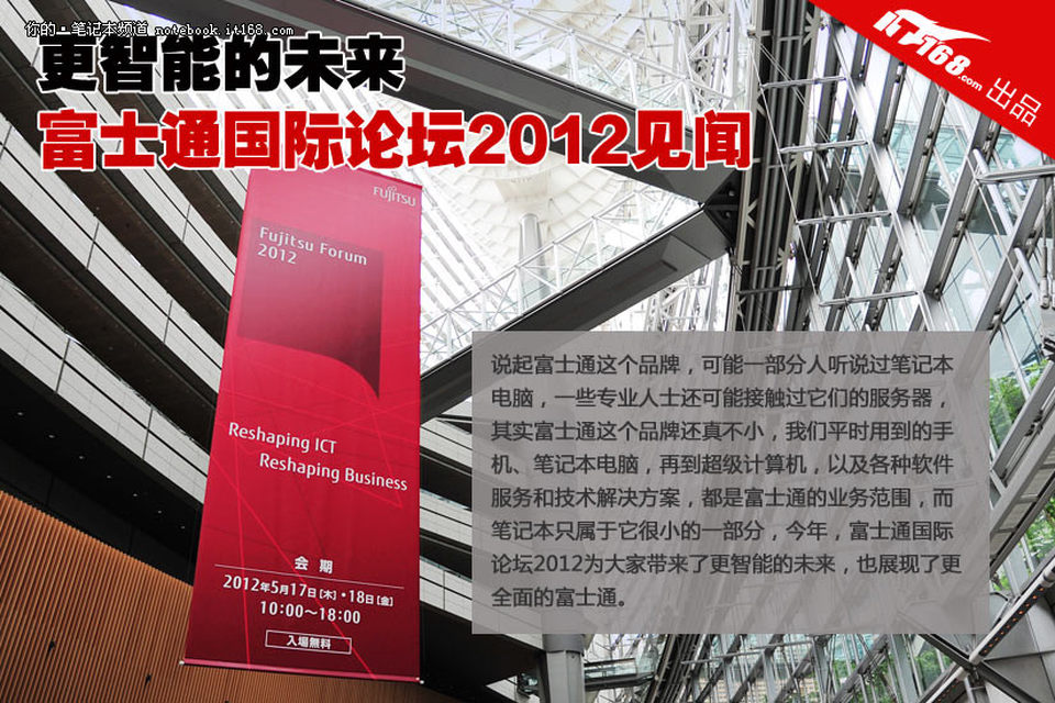 说起富士通这个品牌,可能一部分人听说过笔记本电脑,一些专业人士还可能接触过它们的服务器,其实富士通这个品牌还真不小,我们平时用到的手机、笔记本电脑,再到超级计算机,以及各种软件服务和技术解决方案,都是富士通的业务范围,而笔记本只属于它很小的一部分,今年,富士通国际论坛2012为大家带来了更智能的未来,也展现了更全面的富士通。