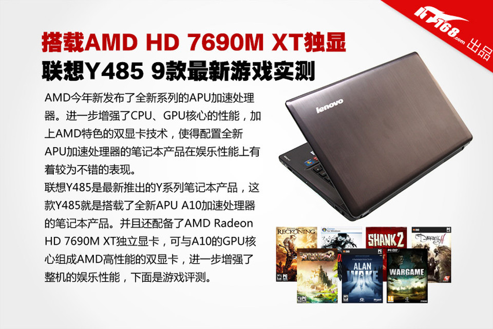 联想Y485是最新推出的Y系列笔记本产品,这款Y485就是搭载了全新APU A10加速处理器的笔记本产品。并且还配备了AMD Radeon HD 7690M XT独立显卡,可与A10的GPU核心组成AMD高性能的双显卡,进一步增强了整机的娱乐性能,下面是游戏评测。