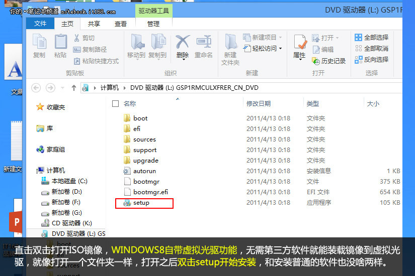 直击双击打开ISO镜像,WINDOWS8自带虚拟光驱功能,无需第三方软件就能装载镜像到虚拟光驱,就像打开一个文件夹一样,打开之后双击setup开始安装,和安装普通的软件也没啥两样。