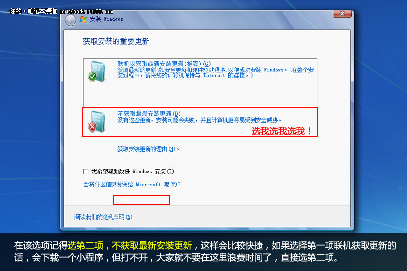 在该选项记得选第二项,不获取最新安装更新,这样会比较快捷,如果选择第一项联机获取更新的话,会下载一个小程序,但打不开,大家就不要在这里浪费时间了,直接选第二项。