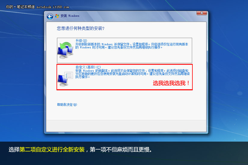 选择第二项自定义进行全新安装,第一项不但麻烦而且更慢。