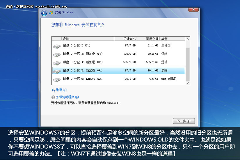 选择安装WINDOWS7的分区,提前预留有足够多空间的新分区最好,当然没用的旧分区也无所谓,只要空间足够,原空间里的内容会自动保存到一个WINDOWS.OLD的文件夹中。也就是说如果你不要想WINDOWS8了,可以直接选择覆盖到WIN7到WIN8的分区中去,只有一个分区的用户即可选用覆盖的办法。【注:WIN7下通过镜像安装WIN8也是一样的道理】