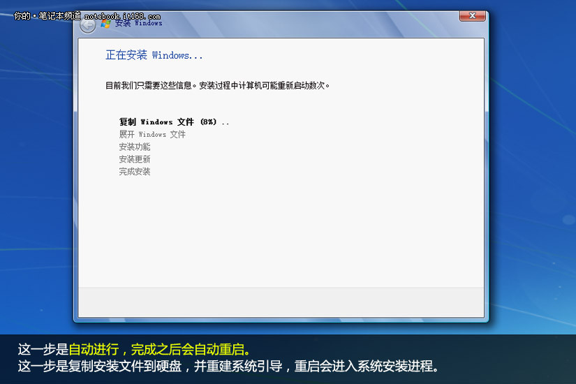 这一步是复制安装文件到硬盘,并重建系统引导,重启会进入系统安装进程。