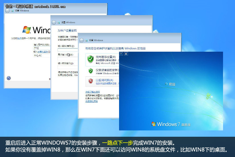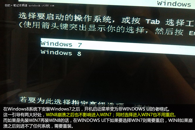 而如果是先装WIN7再装WIN8的话,在WINDOWS UI下如果要选择WIN7则需要重启,WIN8如果崩溃之后则进不了任何系统,需要重装。