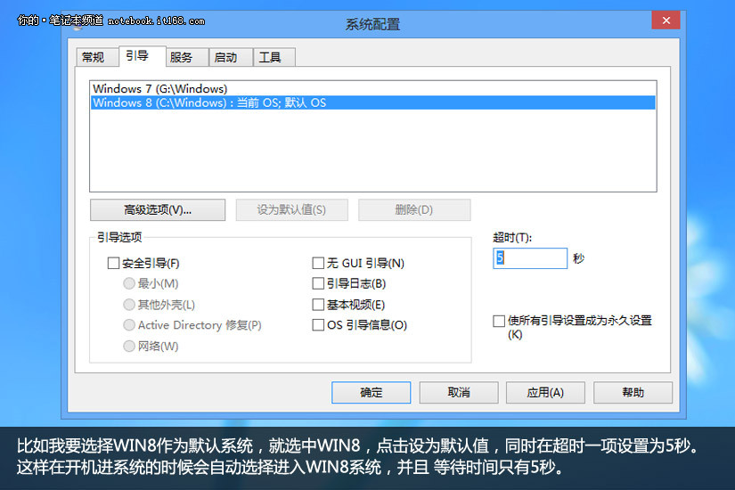 比如我要选择WIN8作为默认系统,就选中WIN8,点击设为默认值,同时在超时一项设置为5秒。