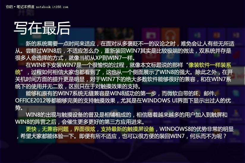 在WIN8下安装WIN7是一个很愉悦的过程,就像本文标题说的那样“像装软件一样装系统”,过程如何相信大家也都看到了,这也从一个侧面展示了WIN8的强大。除此之外,在开关机时间方面的提升更是明显,对于WIN7下的绝大多数软件能够很好的兼容,和在WIN7系统下的使用并无二致,区别只在于对触摸效果的支持。