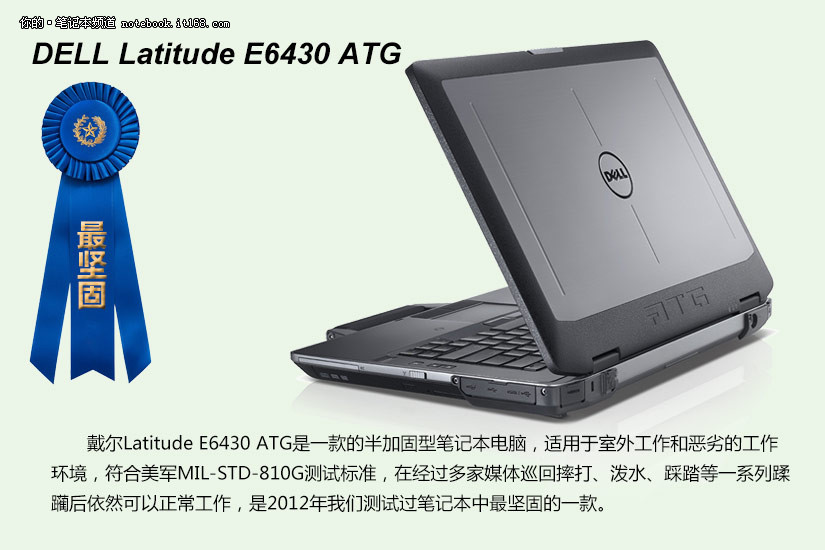 戴尔Latitude E6430 ATG是一款的半加固型笔记本电脑,适用于室外工作和恶劣的工作环境,符合美军MIL-STD-810G测试标准,在经过多家媒体巡回摔打、泼水、踩踏等一系列蹂躏后依然可以正常工作,是2012年我们测试过笔记本中最坚固的一款。