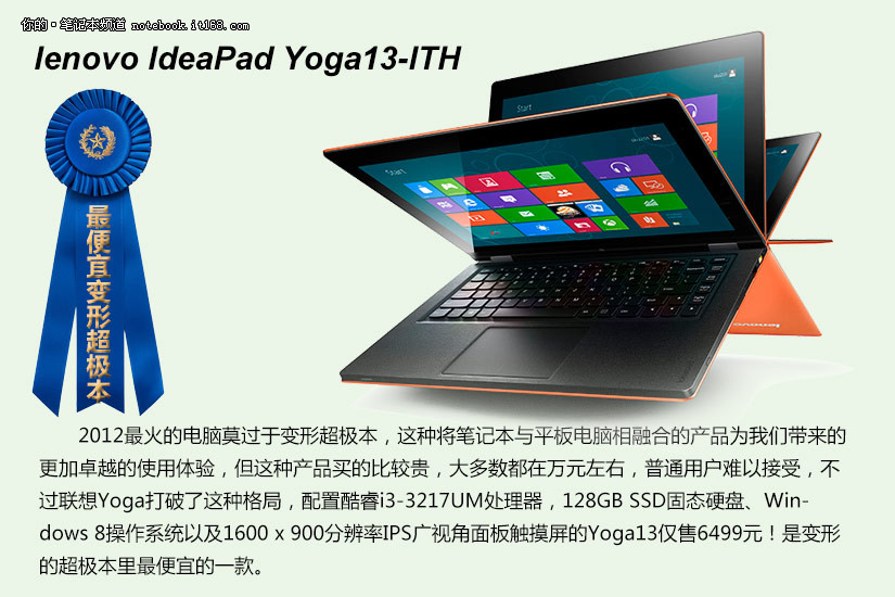 2012最火的电脑莫过于变形超极本,这种将笔记本与平板电脑相融合的产品为我们带来的更加卓越的使用体验,但这种产品买的比较贵,大多数都在万元左右,普通用户难以接受,不过联想Yoga打破了这种格局,配置酷睿i3-3217UM处理器,128GB SSD固态硬盘、Windows 8操作系统以及1600 x 900分辨率IPS广视角面板触摸屏的Yoga13仅售6499元!是变形的超极本里最便宜的一款。