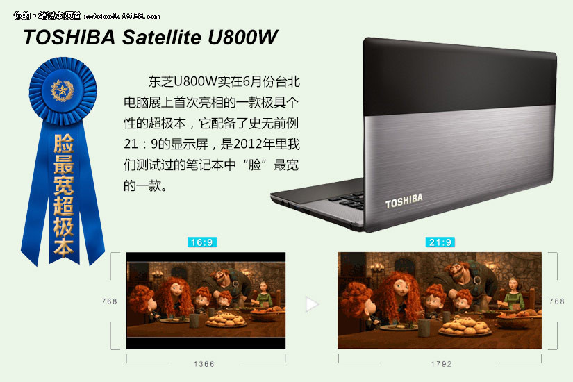 东芝U800W实在6月份台北电脑展上首次亮相的一款极具个性才超极本,它配备了史无前例21:9的显示屏,是2012年里我们测试过的笔记本中“脸”最宽的一款。