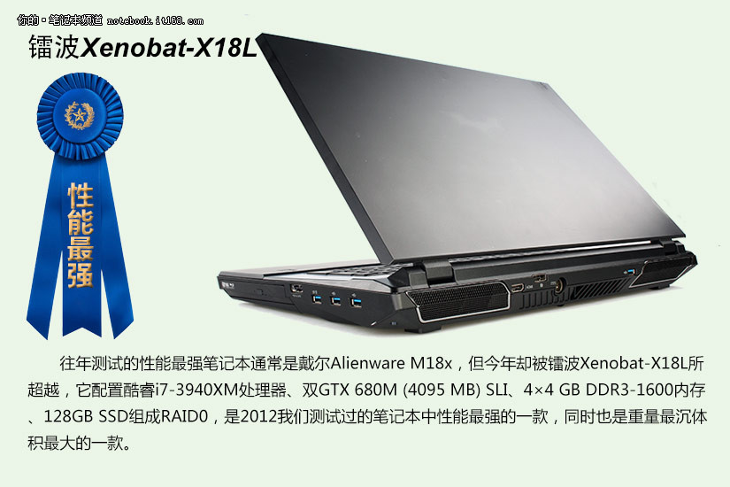 往年测试的性能最强笔记本通常是戴尔Alienware M18x,但今年却被镭波Xenobat-X18L所超越,它配置酷睿i7-3940XM处理器、双GTX 680M (4095 MB) SLI、4×4 GB DDR3-1600内存、128GB SSD组成RAID0,是2012我们测试过的笔记本中性能最强的一款,同时也是重量最沉体积最大的一款。