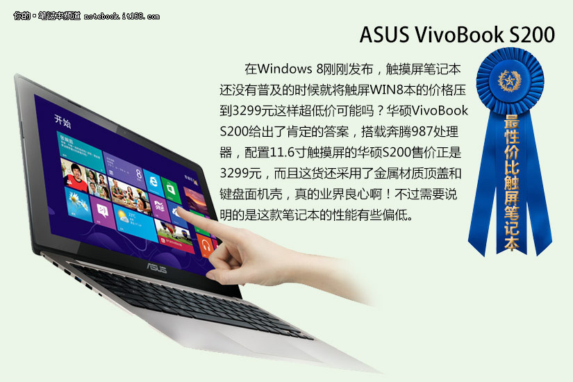 在Windows 8刚刚发布,触摸屏笔记本还没有普及的时候就将触屏WIN8本的价格压到3299元这样超低价可能吗?华硕VivoBook S200给出了肯定的答案,搭载奔腾987处理器,配置11.6寸触摸屏的华硕S200售价正是3299元,而且这货还采用了金属材质顶盖和键盘面机壳,真的业界良心啊!不过需要说明的是这款笔记本的性能有些偏低。