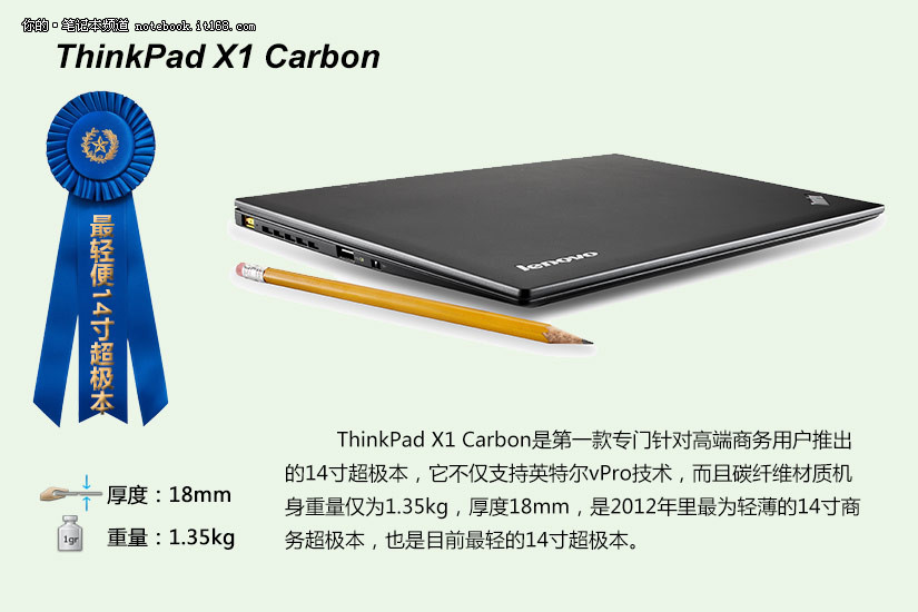 ThinkPad X1 Carbon是第一款专门针对高端商务用户推出的14寸超极本,它不仅支持英特尔vPro技术,而且碳纤维材质机身重量仅为1.35kg,厚度18mm,是2012年里最为轻薄的14寸商务超极本,也是目前最轻的14寸超极本。