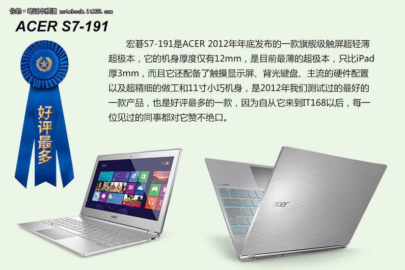 宏碁S7-191是ACER 2012年年底发布的一款旗舰级触屏超轻薄超极本,它的机身厚度仅有12mm,是目前最薄的超极本,只比iPad厚3mm,而且它还配备了触摸显示屏、背光键盘、主流的硬件配置以及超精细的做工和11寸小巧机身,是2012年我们测试过的最好的一款产品,也是好评最多的一款,因为自从它来到IT168以后,每一位见过的同事都对它赞不绝口。