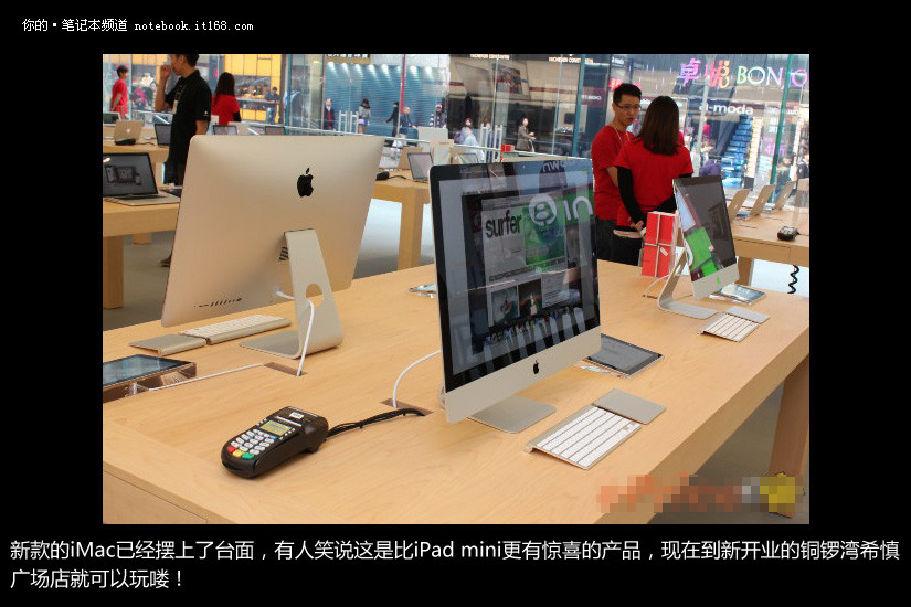 新款的iMac已经摆上了台面,有人笑说这是比iPad mini更有惊喜的产品,现在到新开业的铜锣湾希慎广场店就可以玩喽!