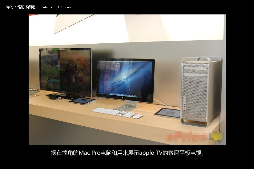 摆在墙角的Mac Pro电脑和用来展示apple TV的索尼平板电视。