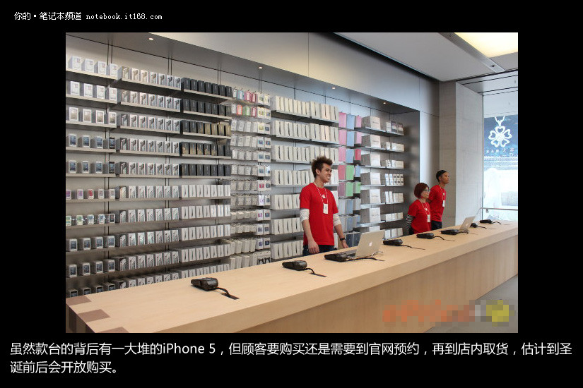 虽然款台的背后有一大堆的iPhone 5,但顾客要购买还是需要到官网预约,再到店内取货,估计到圣诞前后会开放购买。