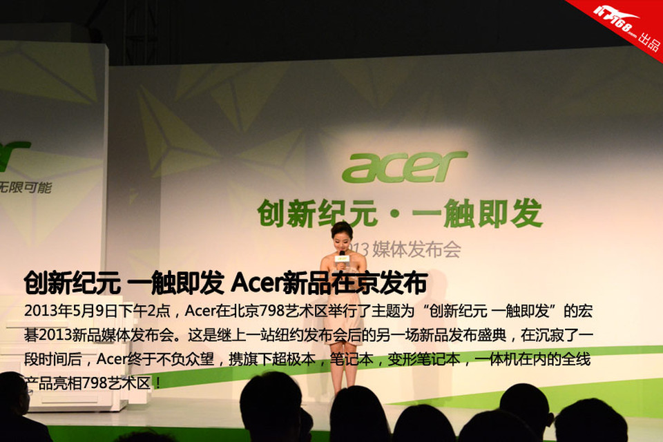 2013年5月9日下午2点,Acer在北京798艺术区举行了主题为“创新纪元 一触即发”的宏碁2013新品媒体发布会。这是继上一站纽约发布会后的另一场新品发布盛典,在沉寂了一段时间后,Acer终于不负众望,携旗下超极本,笔记本,变形笔记本,一体机在内的全线产品亮相798艺术区!