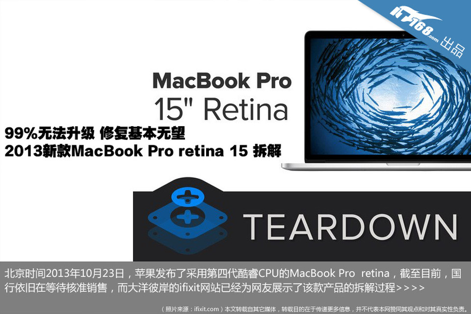北京时间2013年10月23日,苹果发布了采用第四代酷睿CPU的MacBook Pro retina,截至目前,国行依旧在等待核准销售,而大洋彼岸的ifixit网站已经为网友展示了该款产品的拆解过程>>>>